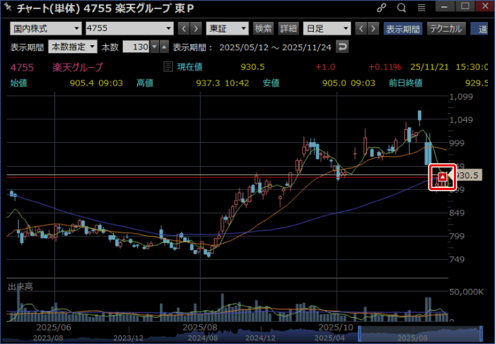 株式分割に伴う権利落ち等を考慮しない株価でチャートを表示します。
