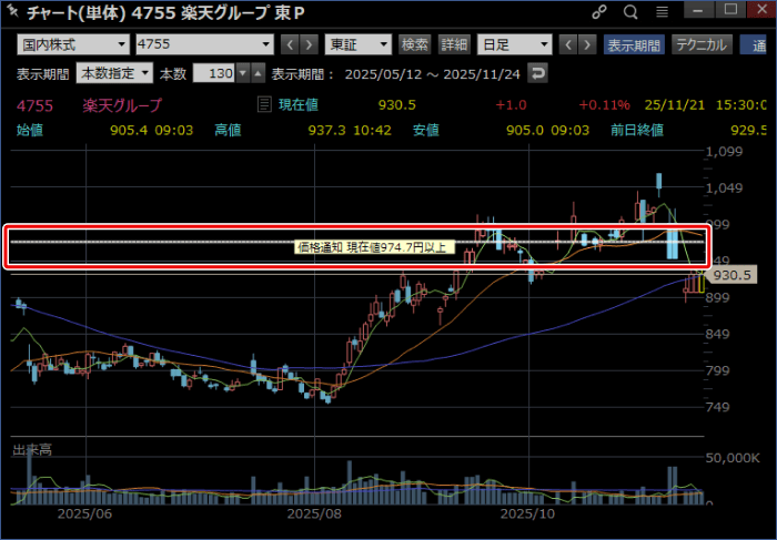 - 「価格通知設定」画面が起動します。チャートで指定した価格が自動で入力されていることを確認し、必要に応じてその他の設定を行います。