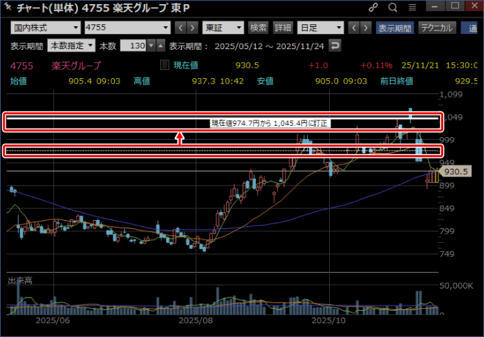 また、表示された指値価格のラインをドラッグ&ドロップすることで、希望価格へ訂正することができます。